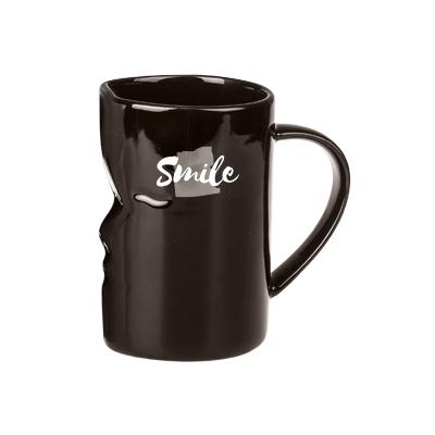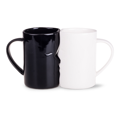 Zestaw dwóch, idealnie dopasowanych do siebie kubków z krawędzią w kształcie twarzy - kubek biały wykonany ze szlachetnej porcelany Royal White, kubek czarny z ceramiki. Produkt jest końcówką serii, mogą na nim występować nakłucia, kropki oraz różnice w odcieniu szkliwa.