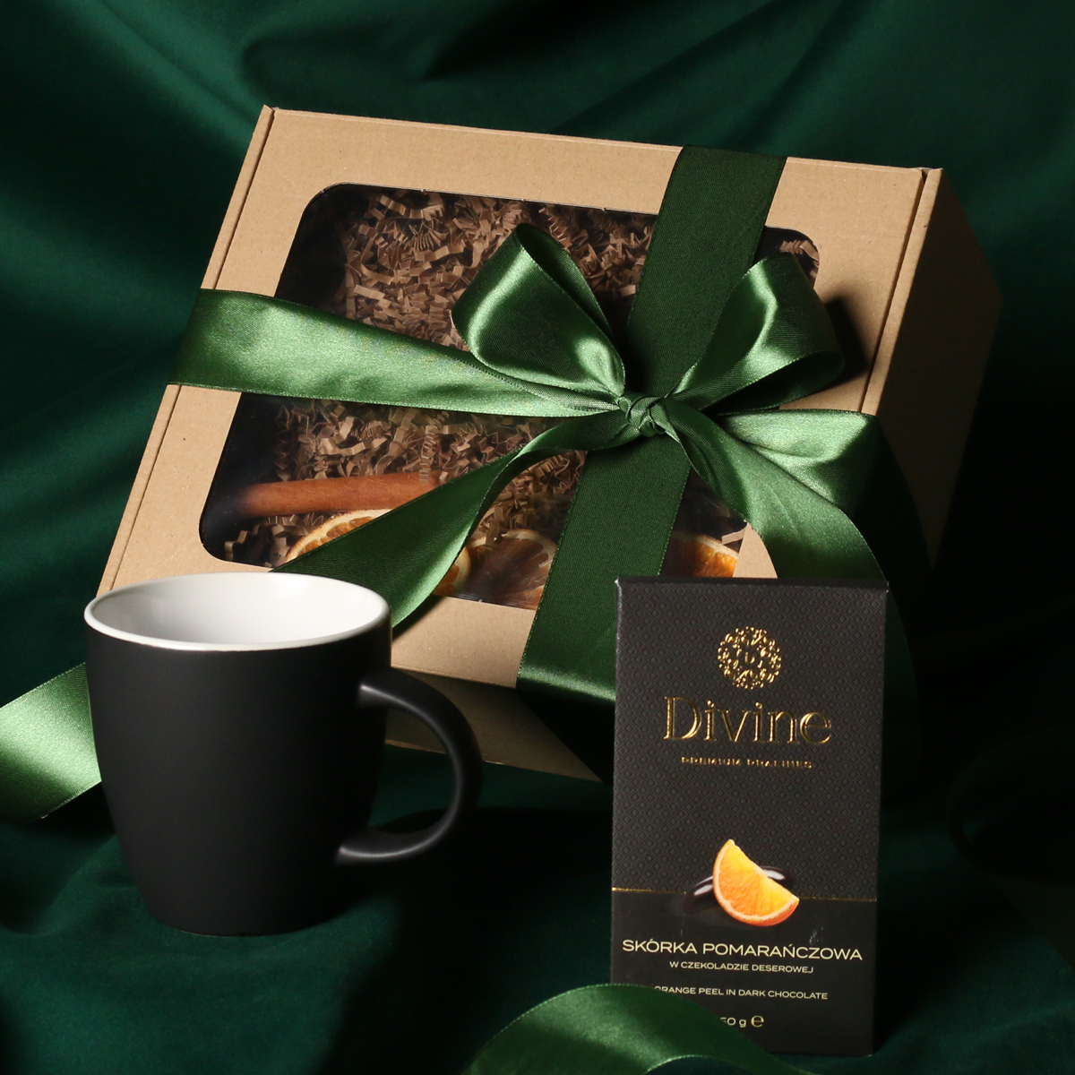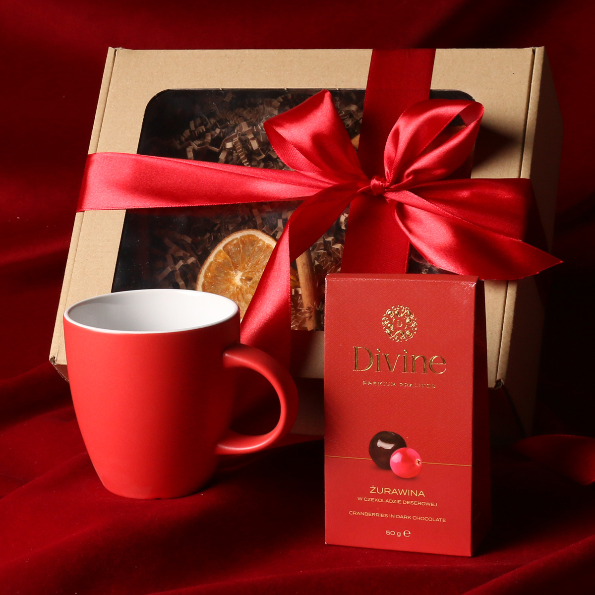 W skład zestawu wchodzą: kubek Fiord czerwono-biały / granatowy-biały / czarny-biały z możliwością zdobienia, Divine Pralines - żurawina w czekoladzie (czerwony) / borówki w czekoladzie (granatowy) / skórka pomarańczy w czekoladzie (czarny) Całość w stylowym opakowaniu z tektury eco z okienkiem. Opcje dodatkowej customizacji: nadruk na kubku, bilecik z logo firmy, wstążka lub obwoluta z motywem zimowym wzbogacona złoceniem