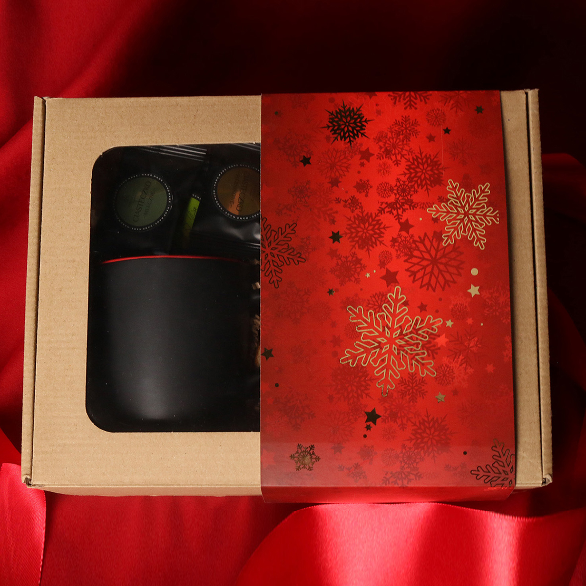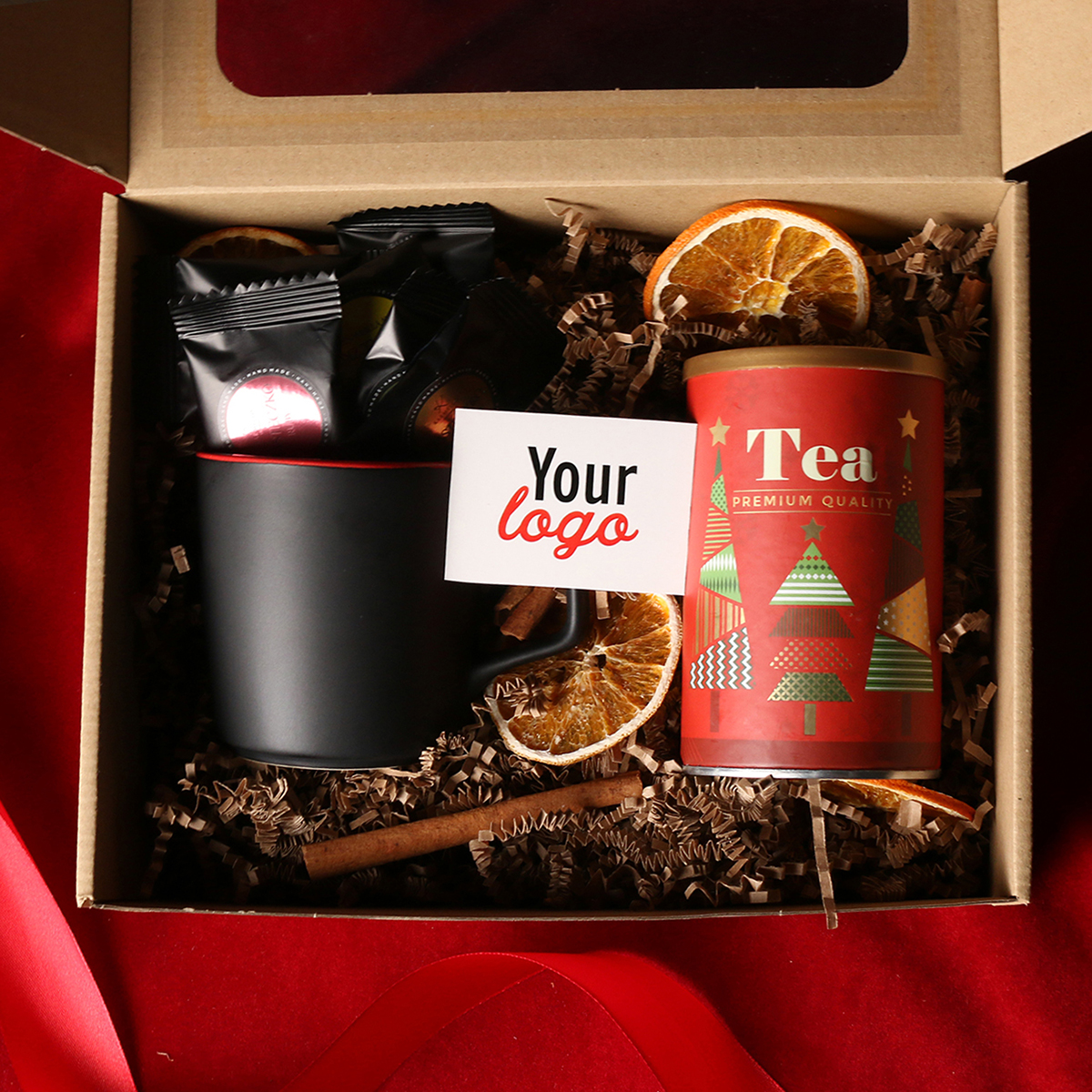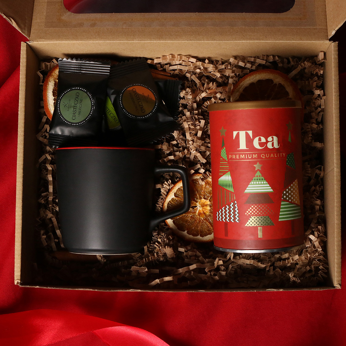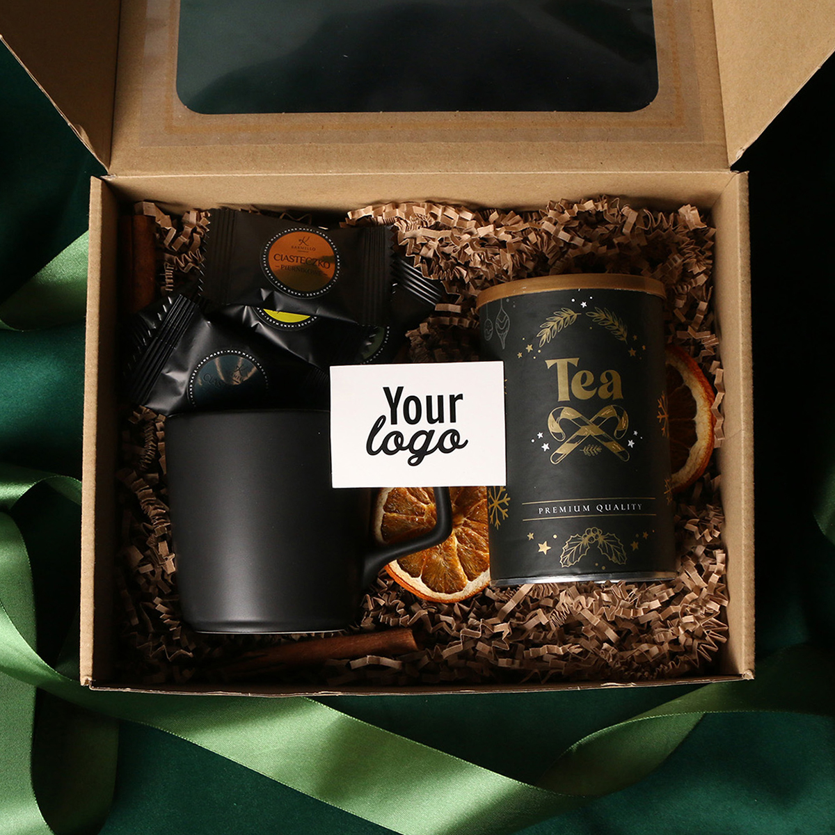 W skład zestawu wchodzą: kubek Barrel Supreme czarno-czwrwony / czarny-reflex blue / czarny-czarny z możliwością zdobienia, zielona herbata Sencha z wiśniami, płatkami róży zapakowana w tubę z motywem zimowym, 8 stuk czekoladek - mix smaków. Całość w stylowym opakowaniu z tektury eco z okienkiem. Opcje dodatkowej customizacji: nadruk na kubku, bilecik z logo firmy, wstążka lub obwoluta z motywem zimowym wzbogacona złoceniem.